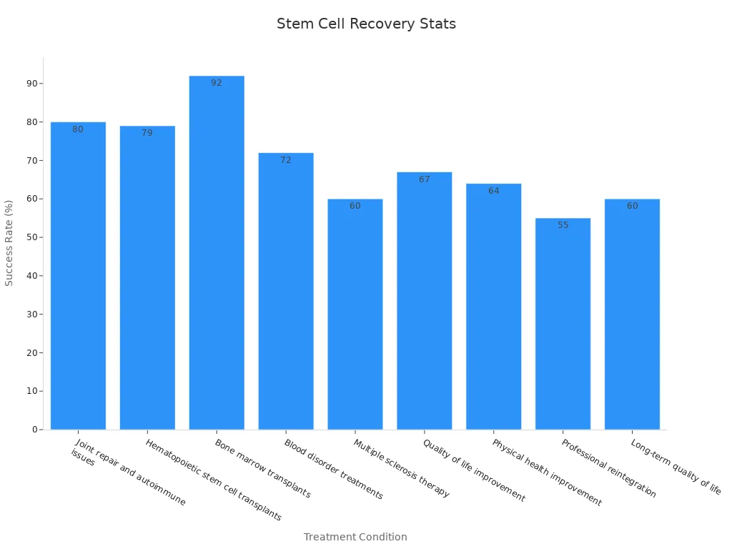 Stem cells accelerate recovery by replacing damaged cells and promoting healing. For instance, hematopoietic stem cell transplants have a 79% success rate in treating blood disorders, with many patients reporting significant quality-of-life improvements. Bone marrow transplants, with a 92% survival rate, are another example of how stem cells contribute to recovery.