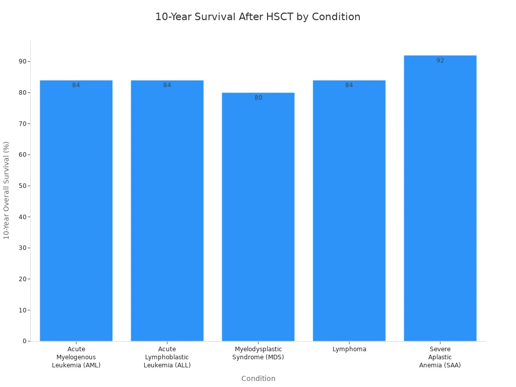 Children with leukemia have also been helped a lot. Recent studies show that kids with very high-risk acute lymphoblastic leukemia (ALL) have a 65% five-year survival rate after stem cell transplant. For acute myeloid leukemia (AML), the five-year survival rate is 74%. These numbers show how well hematopoietic stem cell transplantation works.