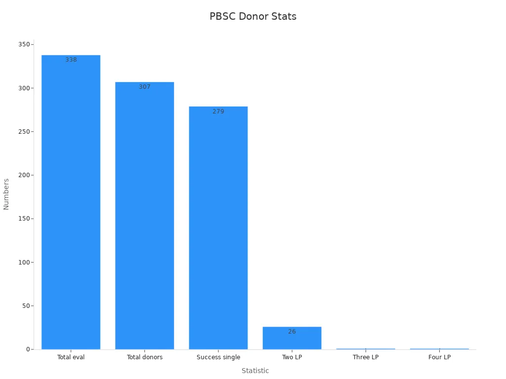The screening success rate is high. Out of 338 collections reviewed, 307 donors were eligible. Most donors (90.9%) finished with one leukapheresis session. Only a few needed extra sessions. The average donor age was 37 years. Doctors checked health markers like hemoglobin to ensure safety.